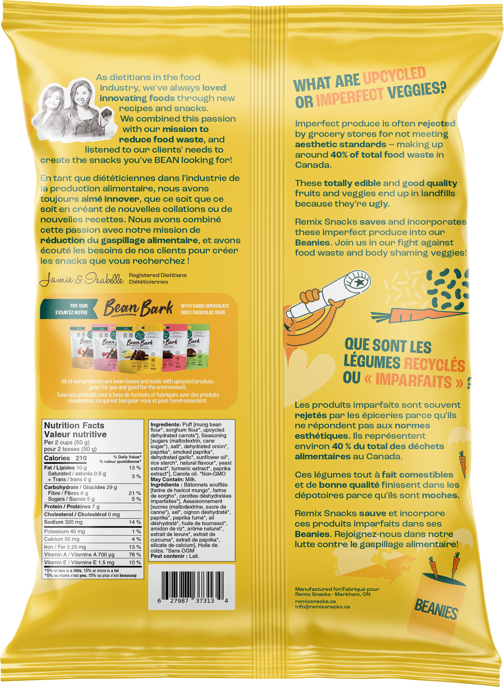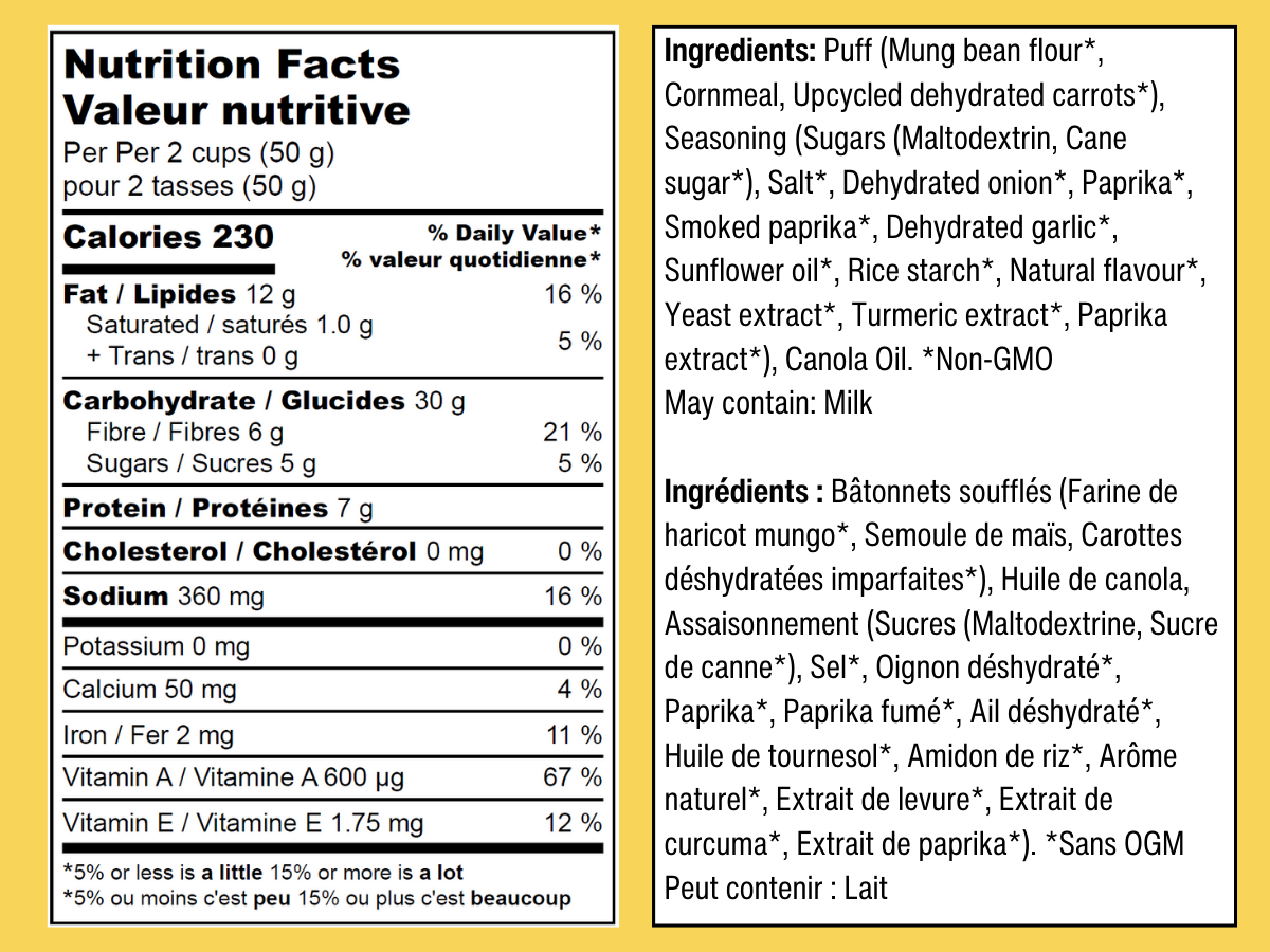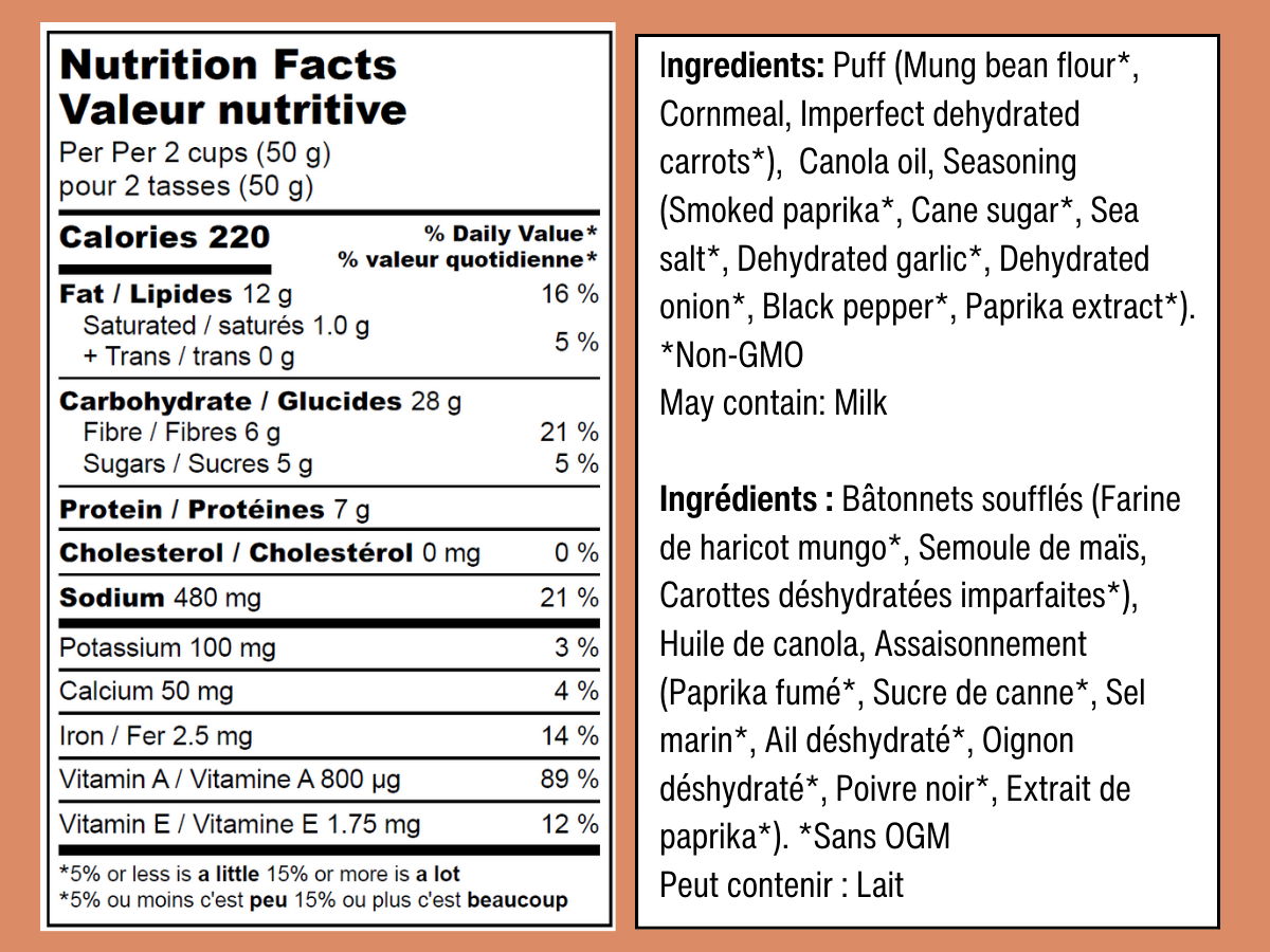 "Soufflé (Farine de haricot mungo*, Farine de sorgho*, Carottes déshydratées recyclées*), Assaisonnement (Paprika fumé*, Sucre de canne*, Sel de mer*, Ail déshydraté*, Oignon déshydraté*, Poivre noir*, Extrait de paprika*), Canola *Non-OGM