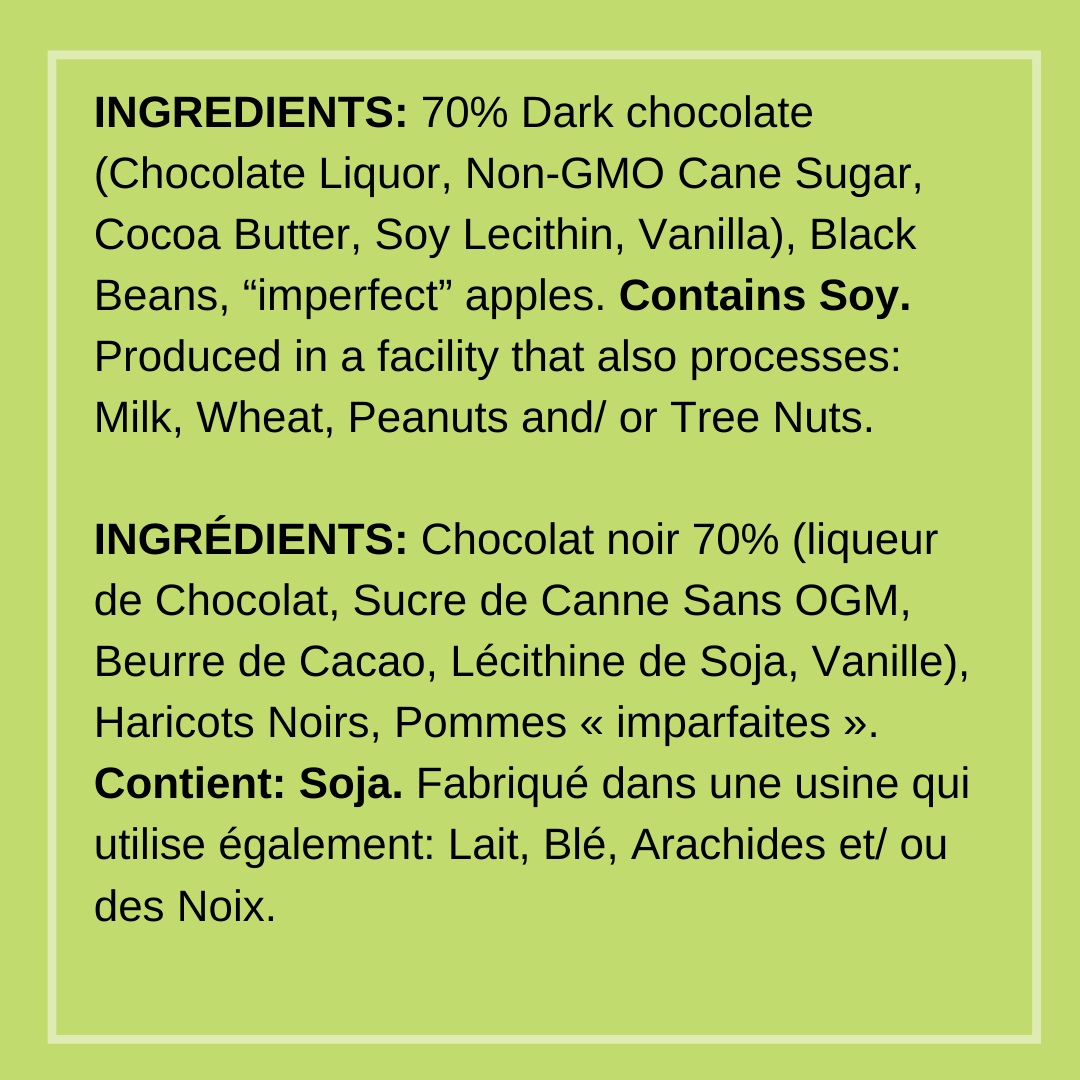 70% Dark Chocolate (Chocolate Liquor, Sugar*, Cocoa Butter, Soy Lecithin, and Vanilla), Black Beans*, "Imperfect" Apples*. *Non-GMO. Contains Soy. May contain Milk, Wheat, Peanuts, and/or Tree Nuts.